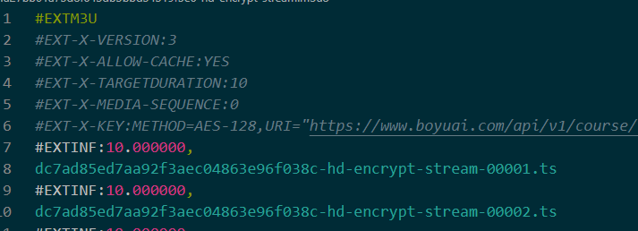 其中比较有用的部分在于第6行,使用的加密方式为AES-128,密钥地址为URL内容,分段的视频短链名称为第8行第10行所示,此处的分段视频的名称并不是详细路径而是相对的,只有名字。